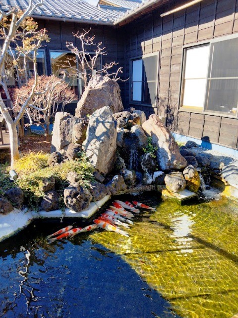 星音の湯の中庭にある池では、水が冷たいのか鯉が一列に並んで身を寄せ合ってジッとしています