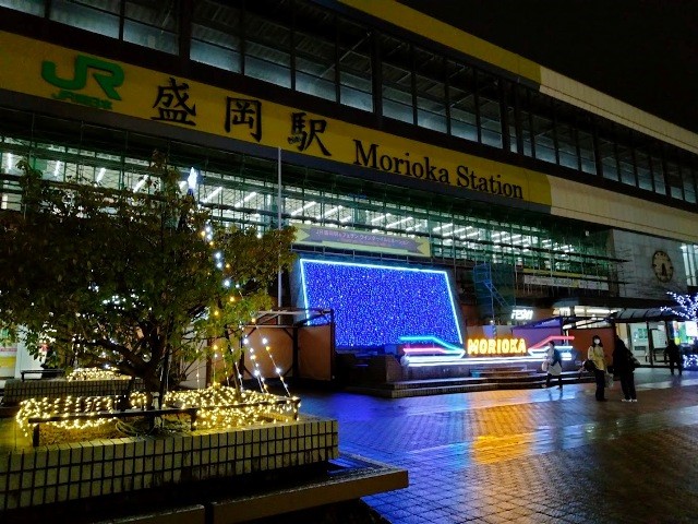 盛岡駅に着いて盛岡つなぎ温泉行きのバスの時刻を確認しました。盛岡駅前はイルミネーションでとてもきれいでした。雪が降り始めていました。盛岡駅で夕食を済ませ、駅前のバス乗り場から岩手県交通の盛岡つなぎ温泉行きのバスに乗りました。この頃にはもう雪がシンシンと降っています。