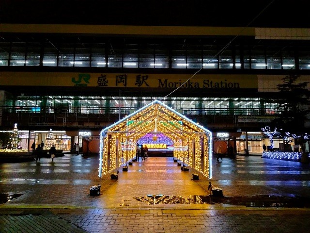 イルミネーション輝く盛岡駅、路面にはこの時点でまだ積雪はありません