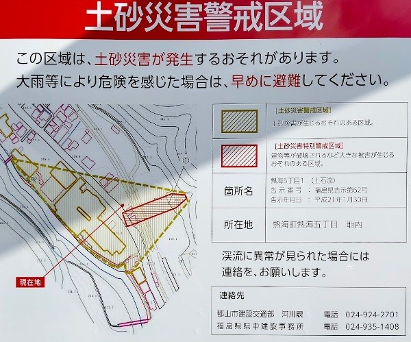 山の上から崖崩れ〜土石流の恐れあり、一応両側の谷筋に砂防ダムが有るけれど...