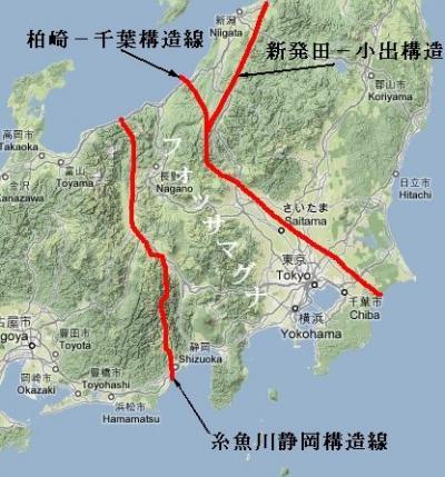 日本列島はもともとユーラシア大陸でしたが、ここから約2千万年前に分離して、1千7百万年前には大陸との間に海がある島になりました。それが1千6百万年前にプレートの軋みでバキッと折れて、東日本と西日本に分かれました。この割れ目の大きな溝を「フォッサマグナ」と呼びます。この台形のようなU字溝の大部分は、新しい地層によって埋め立てられ、これらが隆起して富士山を含む南北方向の火山列ができました。フォッサマグナは、日本列島がアジア大陸から離れる時にできた大地の裂け目と考えられています。糸魚川−静岡構造線は、日本列島を地質学的な東北日本と西南日本に分ける断層であり、フォッサマグナの西側の境界断層でもあります。この断層は、北アメリカプレートとユーラシアプレートの境界とも考えられていますが、両プレートの境界については、諸説があります。フォッサマグナの東側境界は、柏崎−千葉構造線です。