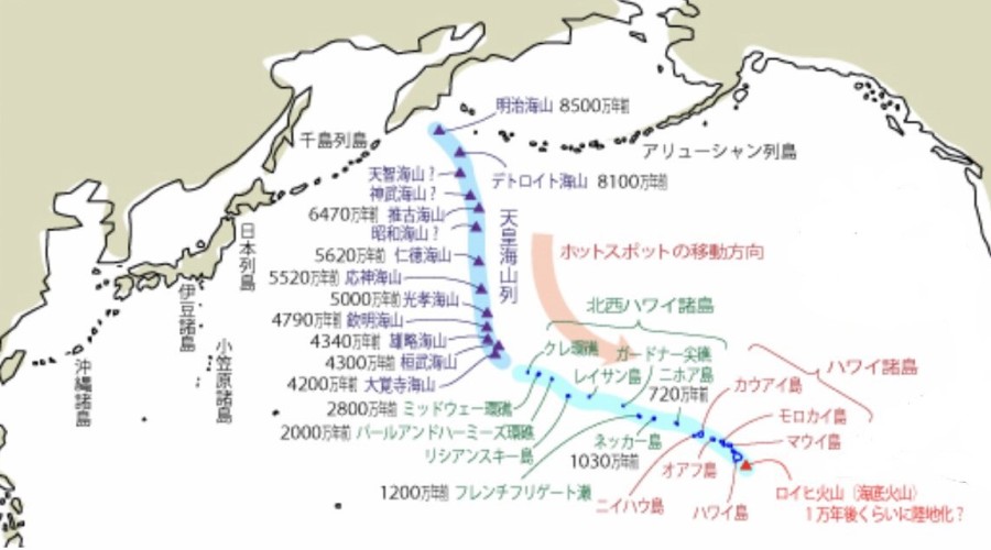 カムチャツカ半島から東へ円弧状にアリューシャン列島が伸びてアラスカへ続いています。その南は海溝となっています。またカムチャツカ半島から南へ北太平洋海山列が続き、俗称「天皇海山列」と呼ばれます。海溝の深い海の底にニョキニョキと高い山がそびえ、海山列の先端から、突端が海の上に出た「北西ハワイ諸島」へと連なり、カウアイ島、オアフ島などのハワイ諸島へとつながります。ハワイ諸島の地下からマグマが噴いて海山が出来、それが太平洋プレートと共に移動していると考えられます。それは海山が出来た年代から分かることです。一番大きな太平洋プレートの北端は、カムチャッカ半島の東にある海溝からオホーツクプレートに沈み込んでいます。したがって天皇海山列の海山はカムチャツカ半島の手前で沈み込み、本来火山が出来るはずのないところに火山が出来ます。これはプレートの移動とマントルの関係によるものです。この沈み込みの軋みで地震が発生し、時にパチーンとはじけた時にマグニチュウドの大きい大地震となります。このようにハワイ諸島の地下が海山のルーツなのです。ちなみに埼玉・秩父の武甲山は、ハワイ沖の海山が移動して日本列島にぶつかったものです。