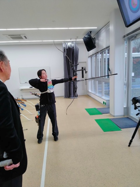 記念式典終了後、雫石町のマイクロバスで雫石町アーチェリーセンターに行き、施設見学と体験をさせてもらいました。鶯宿温泉に隣接した旧南畑小学校の校庭に建設されました。いわて雫石アーチェリーセンターは、2016年希望郷いわて国体でアーチェリー競技を開催したことをきっかけに、国体のレガシーを継承しつつ、今後「アーチェリーの町しずくいし」を目指していくため雫石町が建設した施設で、施設内から屋外の的に向けて最大37名が同時に射つことができる国内最大級のアーチェリー屋内射場です。メインコーチを務める町職員、小野寺まどかさん(26)は2019年茨城国体の成年女子優勝メンバーで「何歳からでも始められ、年齢や性別を問わない生涯スポーツです、是非楽しんでください」と話ておられました。実際に射てみせてくれましたが、70m先の的の風船にピタリ命中、オ〜〜〜と驚きの声が上がり、パチパチ、一斉に拍手が巻き起こりました。アーチェリー競技は韓国が圧倒的強さを誇り、機材も韓国製が多いそうです。競技人口の違いが強さの秘密で、日本も小学生のうちから選手を育てないといけませんが、機材が高価なのが難点です。