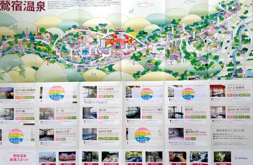 実はこの「虹の似合うまち雫石町」マークの下は閉館した宿なのです。隠れたのは「温泉民宿とちない」、「ホテル長栄館」、「寿広園」、「かどや旅館」、「ホテル赤い風車」です。右上の「ホテル偕楽園」は和風数寄屋造りの宿として有名でしたが、私たちが「ホテル清光荘」に泊まる4日前に事業停止、破産申請の準備に入りました。実は最盛期にはこのパンフレットの倍以上の温泉旅館があったのですから、いかに鶯宿温泉がピンチなのかが分かりますね。レムナント鶯宿のように素泊り専門に転換する宿も出てきました。