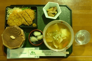 レストラン『もうもう亭』でのランチは左写真、郷土料理のひっつみ(すいとん)に、地場産の雑穀入りのごはん、四元豚のトンカツ、がっくら漬け、メンマなどの小鉢が付いた『ひっつみ定食』(1000円)でした。おすすめの一品というだけあって、美味しいだけでなく、ボリュームも満点でした。