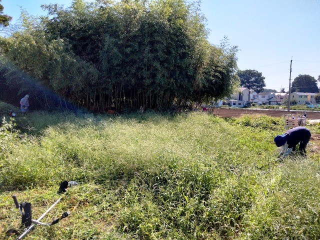2022年9月16日(金) 畑作業の前に竹林の整備作業…4名 竹林の外側はこんな状態で、どこから手を付けようかと呆然とする有様でした 鎌を使い手作業で草刈りする人と、左下電動草刈り機でご覧のようにバリカンする人