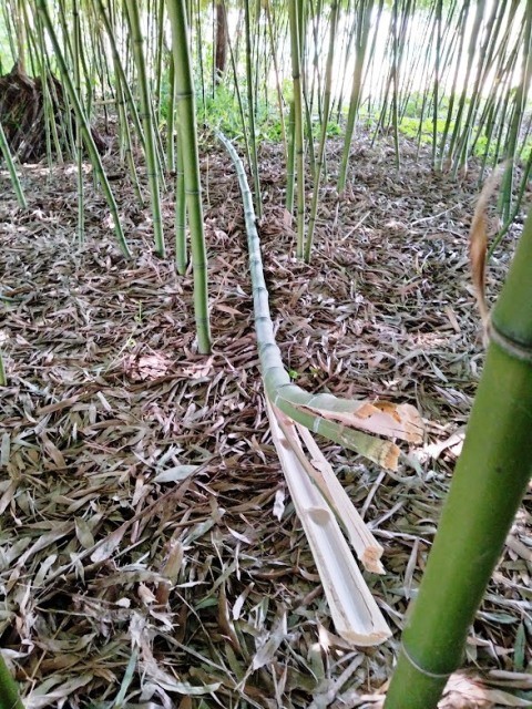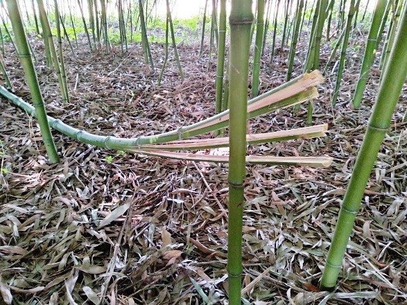 伐りましたが、しなった竹を切ったら根元が割れてビシッと跳ねて指をちょっと切りました(不覚!)