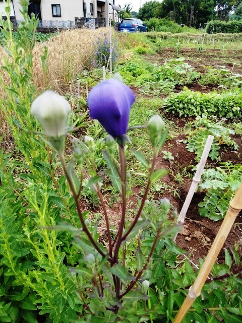 タマネギの跡地3畝の左端はヤーコンを植えました その右2畝のカボチャの周りを除草
