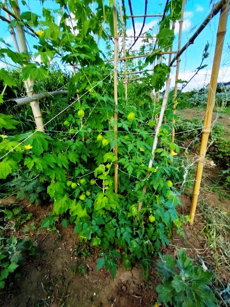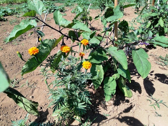 茄子に寄り添ったコンパニオンプランツのマリーゴールドが咲きました