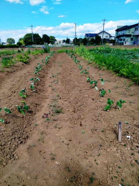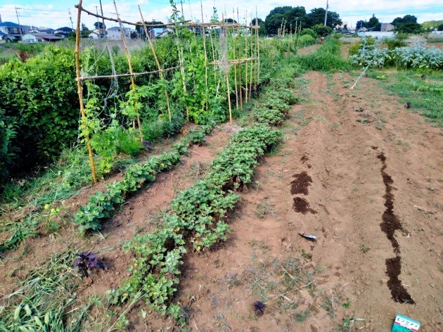 前回Tさんから頂いたサツマイモの苗60本を、ニンジンの畝の間に定植しましたが・・・