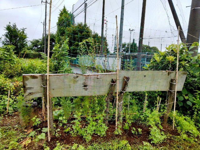 エコクラブ看板の裏に、昨年同様フウセンカズラのネットを張りました