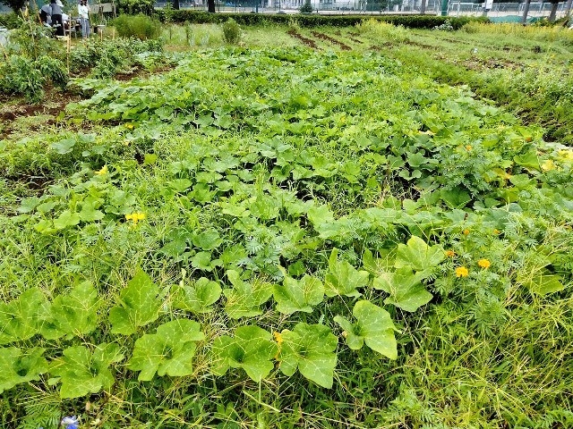 ・・・ヒシバやスベリヒユに覆いかぶさるようにカボチャの大きな葉が・・・