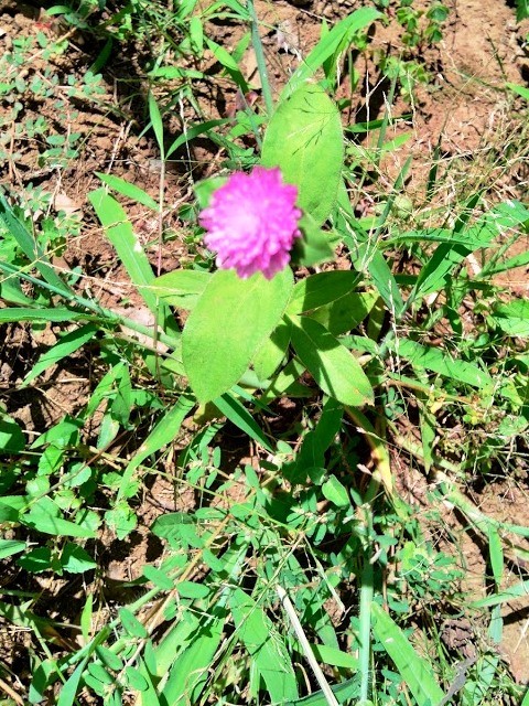 ナント!ふじみ野こどもエコクラブの看板の下に「千日紅」が一輪咲いていました