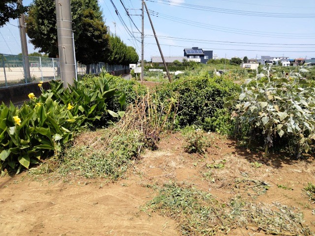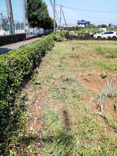 【畑の作業】 枯れたアオイを除去、支柱の竹を抜き、下草を抜きました 左には黄色いカンナの花、奥には生け垣のお茶の木、右にはヒマワリ 草ぼうぼうで、生け垣も伸びてきて除草したい・・・ 草刈り機と生け垣バリカンを使って剪定、除草しました この日も地獄の暑さ、除草は汗ダクダク、水分補給しながらの作業です