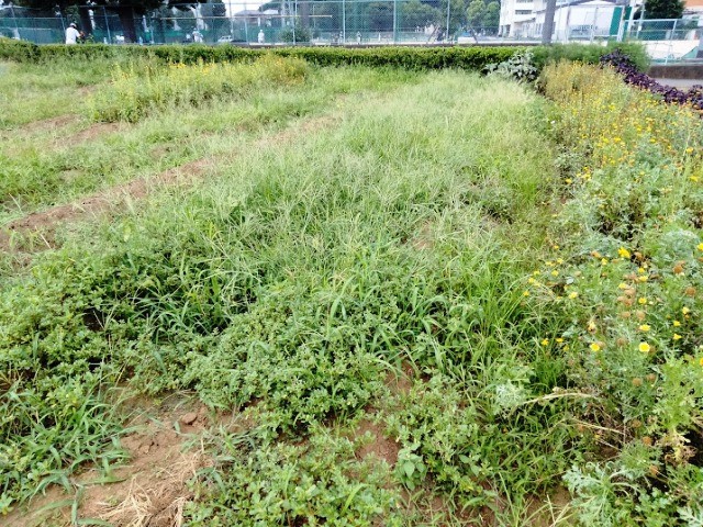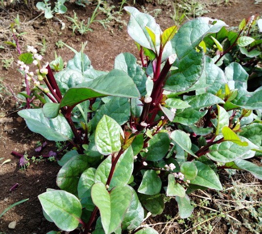 実はツルムラサキは熱帯アジア原産で、つる状で葉のつけ根に紫の実をつけることからこの名前がついたのだそうです。茎や葉が紫がかるタイプと、茎が太めになる緑のタイプがあり、ともに加熱すると土臭いにおいと独特のぬめりが生まれます。この土臭いにおいが嫌だと言って食べない人も居ます。しかしビタミンCやカルシウムを非常に多く含む夏場の健康野菜として、栄養価の高さが注目されているのです。赤茎と青茎はてっきりつる(茎)の色のことだと思い、なぜ「ツルミドリ」と言わないのだろう?と冗談言っていましたが、そういうことだったわけですね。赤茎のツルムラサキは、小さく泡みたいな花がいっぱい出て、この丸い袋みたいなものが開いて花が咲きます。そして実が出来ます。青茎のツルムラサキもやがて花と実が出来るはずですが、その前に血も涙も無くプッツンと切られてしまうのです。ツルムラサキの収穫は葉を摘んではいけません。つる(茎)をポッキンと折ると、葉の付け根からまたドンドン芽が出て延びるのです。