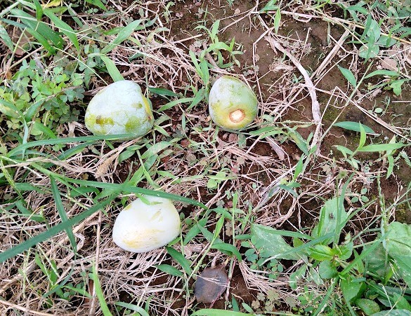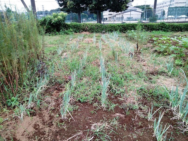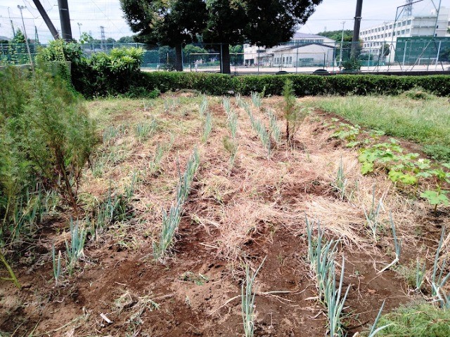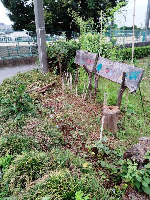 畑作業の間にティータイムがあって、この時にお菓子などを食べながら休憩し、会話に花が咲きます。お茶話ですね。真夏は給水タイムです。御菓子や果物、漬物、お料理、とうもろこしなど、皆さんが持ち寄ります。旅行のお土産なども出て来ます。畑の南端に柿の木があって、これでヒカゲ※が出来るのでほっとします。T工務店に作っていただいた木のテーブルが丸太の足の上に載っています。ここがサロンになるのです。