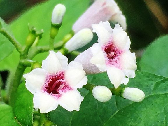 「ヘクソカズラ」なんて変な命名するのは、さては牧野富太郎先生か?いいえ、日本最古の和歌集である『万葉集』の中にも「屎葛(くそかずら)」の名で詠まれているそうです。アカネ科ヘクソカズラ属の蔓(つる)性多年草で、やぶや道端など至る所に生える雑草です。夏に中心部が赤紅色の白い小花をいっぱい咲かせます。葉や茎などを傷つけると、悪臭を放つことから屁屎葛(ヘクソカズラ)と呼ばれるようです。地方によっては、サオトメバナ(早乙女花)とかサオトメカズラ(早乙女蔓)とも呼ばれるそうで、かわいらしい花を咲かせる様子や、花を水に浮かべた姿が田植えをする娘(早乙女)のかぶる笠に似ていることにちなみ名付けられたようです。英語では、Skank vine(スカンクの蔓の意味)、中国植物名(漢名)では鶏屎藤(けいしとう)と呼ばれるそうです