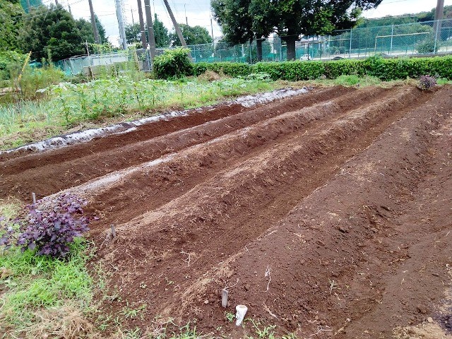 9月6日(火)3畝大根の種を撒いた隣の畝に1列「聖護院大根」の種を撒き、もみ殻をかぶせました