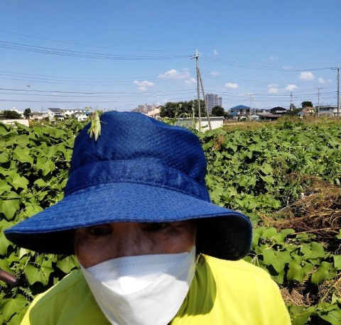 畑にはいろいろな昆虫がいます。前回はカマキリがぴょんと帽子の上に乗った写真を紹介しましたが