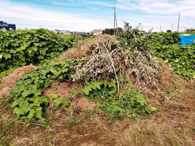 畑の北側には除草した草を積み上げ、山となっています・・・これがやがて良い堆肥になります