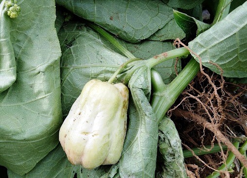 その隣のお茶を覆ったハヤトウリがこの草の山にまで伸びて、中にはハヤトウリの実の赤ちゃんの姿も・・・