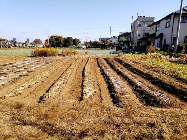 その左2畝は以前から畝成形して堆肥と石灰を撒いて植え付け準備していました