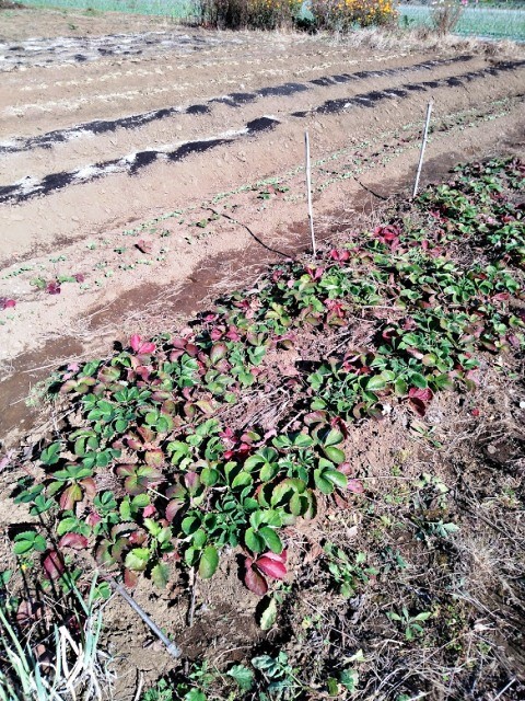 畑の南東側にはイチゴが元気に生えていて、その左隣にイチゴと二十日大根の並列植栽