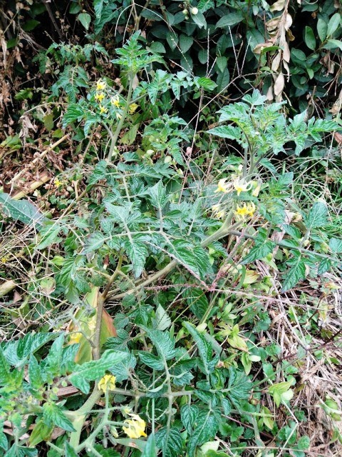 畑の入り口のカンナの陰になぜかミニトマトが生えていました 実も成っています