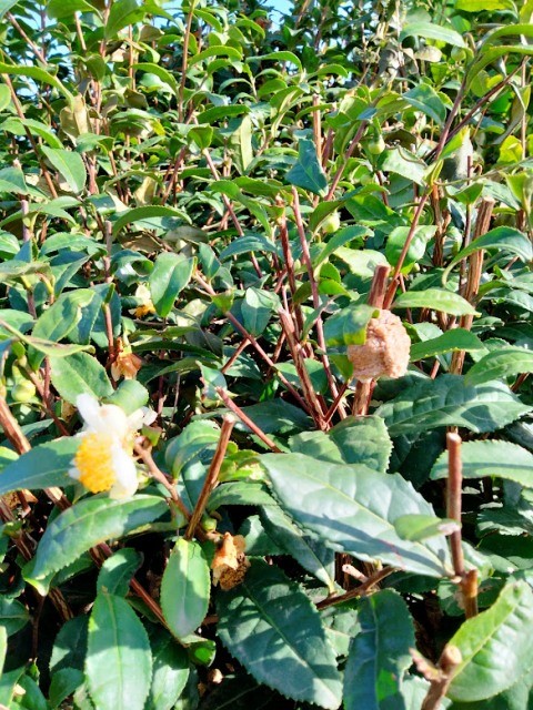 お茶の花が咲いています カマキリの卵が枝に巻き付いています