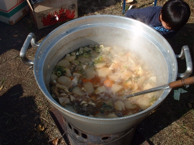 岩手県の北上川流域はさといもの生産に向いた土壌で、昔からさといもが多く作られています。岩手にはねっとりやわらかい舌ざわりが特徴の「二子さといも」と、ホクホクした食感の「津志田芋」、特徴の異なる二つの有名なブランドいもがあり、それぞれ人気があります。さといもの歴史は古く、縄文時代に米よりも早く日本に入ってきたといわれます。古くは万葉集にも記載があり、十五夜や正月に餅ではなく、さといもを供える文化が各地に残っています。「芋の子汁」は秋に旬を迎えるさといもを、にんじん、大根、ごぼう、きのこ、こんにゃく、豆腐、鶏肉等をひと口大の大きさに切ったものを煮込んだ汁物の料理です。一杯で多彩な食材が食べられるので、たんぱく質やビタミン類、食物繊維など、幅広く栄養を摂ることができます。昔は稲刈り後など農作業が一段落した時や人が集まる時のごちそうとして、また、身体を温める料理として振る舞われました。現在は、北上川の川岸にグループで集まり、芋の子汁を食すのが秋の風物詩となっており「芋煮会」や「いもの子食い」と呼ばれます