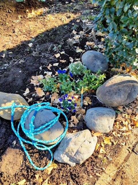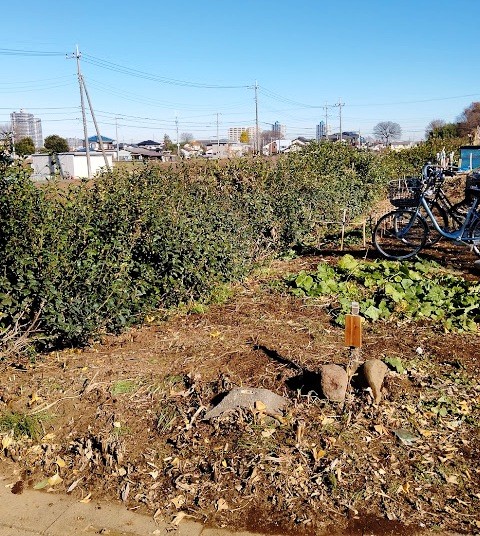 駐輪場とお茶の木の間に有るマーガレットの隣にチューリップの球根を植えました