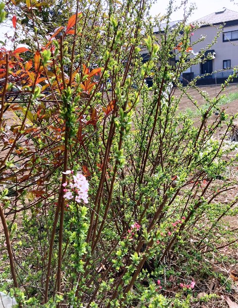 畑の北東端の南天の隣のユキヤナギが咲き出しました