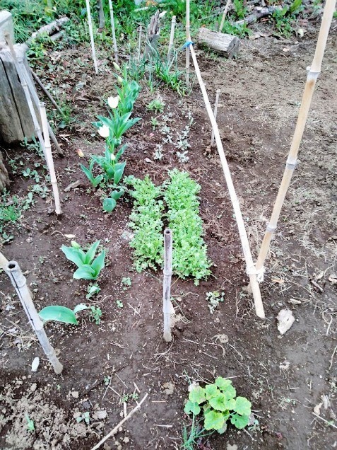 インゲン;五月みどりとシカクマメを撒いた畝に芽が出ていました