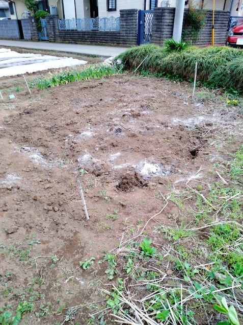 畑南東隅はサトイモスペース、耕して施肥、石灰まいて、ちょっとだけジャガイモも植えました