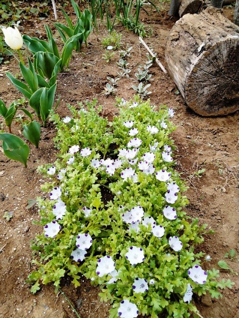 南隅のお花畑にチューリップが咲き、ネモフィラやフランネルソウが大きくなってきました