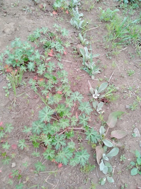 フランネル草の周りにアメリカフウロ 赤い葉があります