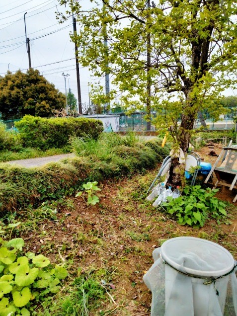 M野谷さんが柿の木周りを除草、こんなところにもアオイが生えてます