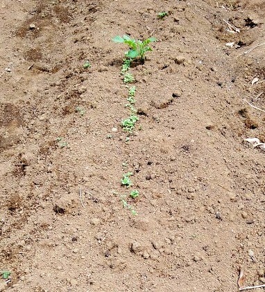 ジャガイモのところに間違って播いた春菊が発芽