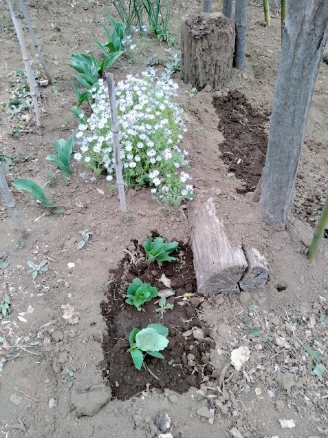 ヒマワリの移植…畑東側(隣の畑との境) ちょっとラークスパーと近過ぎるのでは?