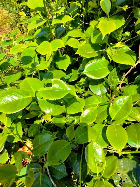 5月のツバキの葉は若々しく、光り輝いています