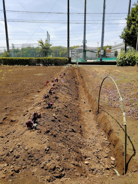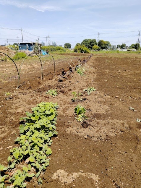 キクイモ移植、手前は朝鮮カボチャの苗