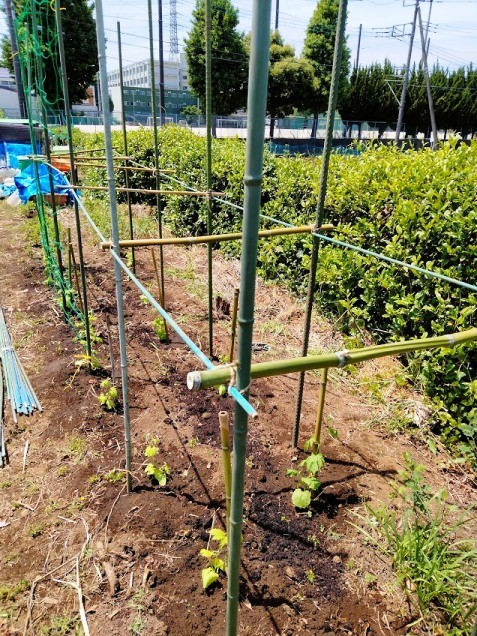 昨年は竹林の竹で作りましたが、どなたか知りませんが畑に置いて行かれた資材使用
