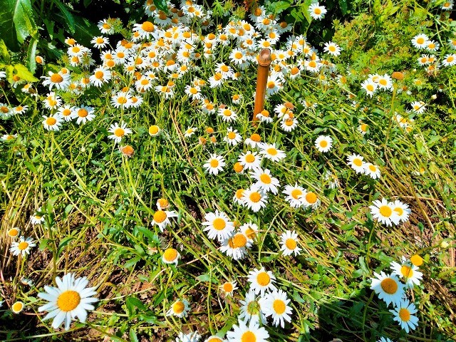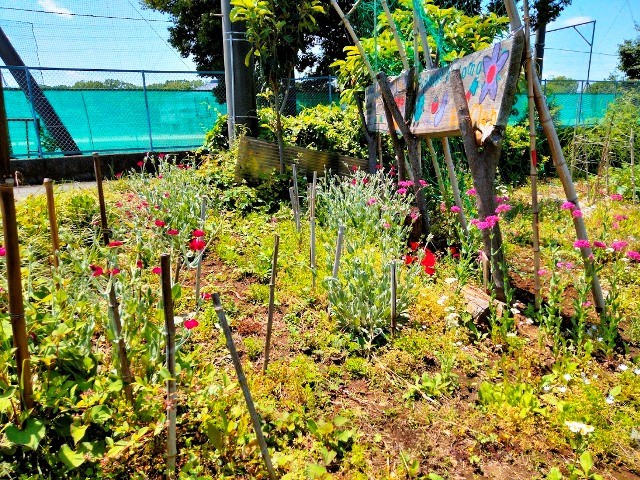 スナップエンドウと絹サヤはもう終わり、ムシトリナデシコ(小町草)とハルジオンが乱舞しています