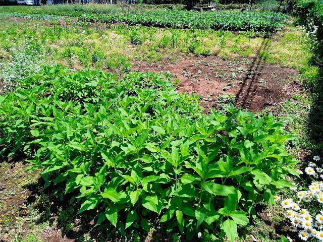 昨年・・・キクイモの向こうの朝鮮カボチャが大きくなってきて、その向こうのスペースにやがて移植予定