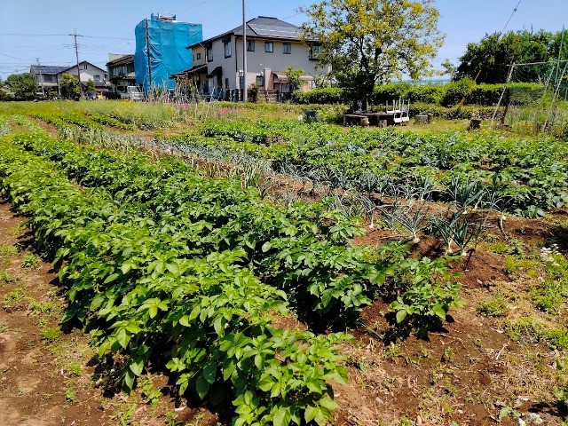 ジャガイモの畝の間に玉葱とニンニクの畝があります