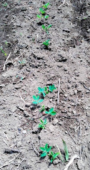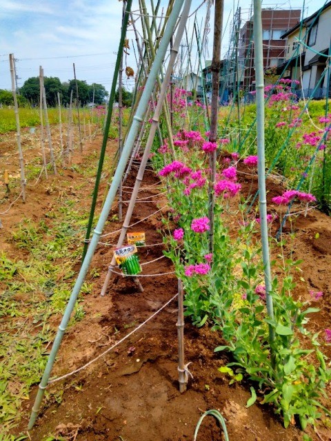 スナップエンドウ、絹サヤの支持棒を抜かず、根元に五角オクラと丸オクラの種を播きました