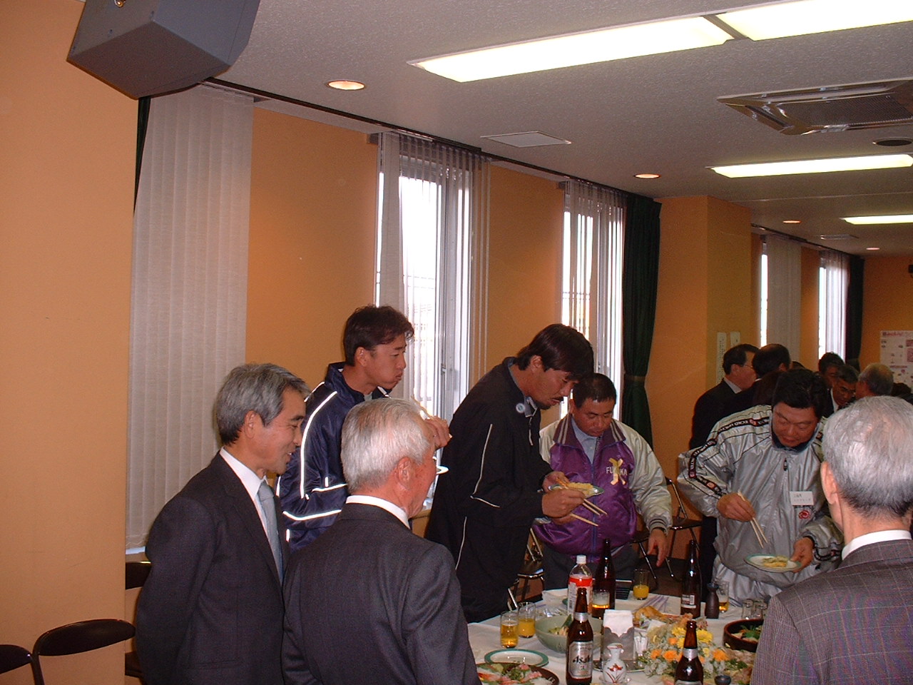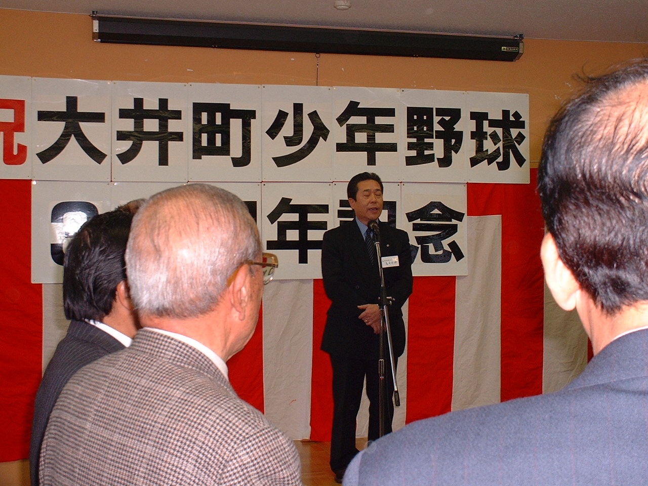 うれし野まちづくり会館において連盟関係者、ご来賓を招いての記念パーティが行われた。ご来賓は大井町島田町長、松尾町議会議長、遠藤教育長、金井塚体育協会会長、吉田体育協会名誉会長、その他大井町体育協会・野球連盟関係者、神山埼玉スポーツセンター代表取締役社長・埼玉県議会議員、埼玉西部、南部、東入間各連盟役員等の関係者、大井町少年野球連盟功労者、上福岡シニア、富士見シニア関係者、そして午前中の少年野球教室の指導をして下さった田辺、竹下、森、小川、松本の各氏である。接待は連盟5チームのお母さん方、世話役は各チームの事務局の皆さんであった。大井町の5チームからは各10名のコーチが出席した。