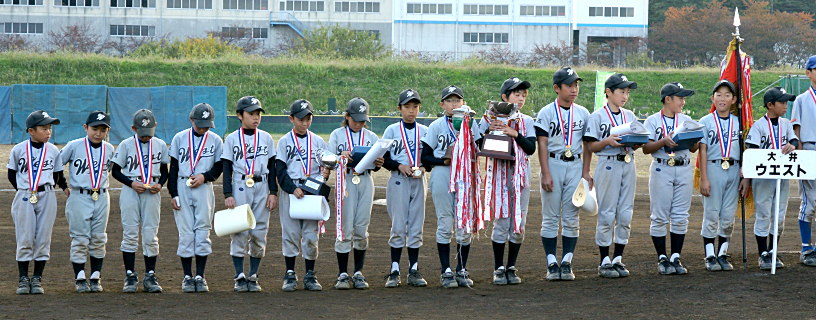 戦況:伊藤投手は三者凡退で仕留める幸先良いスタート、ウエスト6年は投手経験のある選手が6人いるが、貴重な左腕伊藤がマウンドに居ると、前田が捕手に座り、この日は横田をライトに起用するといった布陣ができる。そのライトへこの試合ではライナーが3本、フライが1本飛んだ。しかし横田の守備は安定していた。伊藤の球を6本弾き返してヒットにしたスターナインズの打線は強力だった。日本を守る重要な仕事のかたわら、中澤助監督が分析したデータでは、かなりの強敵だが勝てるはずとのことだった。確かに強いチームだった。こういう相手に左投手がマウンドに上がれば、1塁に出ても走り難い、と言う点で守る側が有利になる。しかも強いチームというのはセンター中心にあらゆる方向に打球が飛ぶ。1塁にランナーがいたときにライト線へ打球が飛び、ランナーが2塁を蹴って3塁を狙う、というような場面では、イチローのような強肩右翼手が居ると心強い。ウエスト史上勝率7割6分でbPの2001年度チーム(平山監督)のときは、ライトに強肩で守備の上手い選手を入れて、秋の南部大会では準々決勝でこのとき優勝の岡ファイターズとサドンデスの激戦の末敗れたが、印象に残る好チームだった。バッテリーが安定して守備陣が締まれば、強打のチーム相手でもそうそう失点しないものだ。この日の野火止スターナインズがまさにそう、相手からみると攻めてはいるのだが思ったほどに点が入らない、イライラする試合だったであろう。1回表はセンターフライ、セカンドフライ、ライトライナー、10球で終わり。その裏1死から、青木幸也主将が右中間を強烈なゴロで破り歓喜のホームラン、ウエスト花火大会の始まりだった。続く前田が同じ右中間にドデカイ一発の3塁打、4番伊藤がショートへ放った当たりも強いゴロでファンブル、前田ホームインして2点先制。この後、大技小技、打ちまくり、13盗塁、グラウンド狭しと走り回り、首位打者阿部永がまたまた打率を上げる3-3、2得点、斬り込み隊長野本大揮が4-3、2得点、青木主将も2得点、前田夏輝が特大3塁打含む4-3、4打点、2得点、永田樹弥も犠打あり、バントヒットありで1得点、最後は山崎裕大がズドーンと一発レフト右を強烈ライナーで破り前田ホームインして7点差になりコールド勝ち。と書くと相手投手が悪いように聞こえるが、決してそんなことはなかった。球はそこそこ速かったし、コントロールも悪くは無かった。相手がウエストでなければ好投手かもしれないが、緩急が無く、真面目に投げてきたことと、強打もあればバントヒットもあるウエスト打線に翻弄されてしまったというのが正直なところか?ドデカイ3塁打を打っている前田の後の打席で相手ベンチから「バントもあるぞ!」という声が飛んだ。普通は3番打者で、その前のバッティングを見ていればそんなこと考えられないが、実は相手ベンチもそれだけ大井ウエストを研究していたということである。昨年新倉フェニックスがウエストの打者に対して深く研究していたことに驚いたことがあったが、多分このホームページを見て研究しているのであろう。ただ、攻撃は水物である。素晴らしい投手の前には沈黙することもある。だからこそ守備が大切だ。2回表は四球とヒットで2死2、3塁のピンチをセカンドフライで切り抜け、3回は1番打者のショート後方のフライをレフトと譲り合ってヒットにしたが、伊藤→青木→野本と牽制で挟んで殺した。4回には先頭の3番打者が伊藤のグラブを弾くヒットで出て、4番もヒット、1死後6番四球で1死満塁、ここでセカンドゴロ、1点は良い、1塁送球で2死、8番セカンドフライで最小失点で切り抜けた。6回も1死後4番のレフトオーバー2塁打からタイムリーで1点取られたがサードへの当たりを永田がバックホームアウトにしたりでなんとか1点に抑えたのが大きかった。1塁手杉浦七海のキャッチングで助けられた場面もあった。走塁の珍プレーもあったが書かないことにしよう(^-^) 2回戦は、去年5年のとき1-3で敗退している和光リバーツインズと予想していたが、ナント!朝志ヶ丘ジャガーズが7-5で勝ってしまった。この試合ジックリ見させて頂いた。逆に義務審判で大井ウエストの試合を見た朝志ヶ丘ジャガーズの指導者はどう思っただろうか?今のウエストは、「次週が楽しみ」状態、今期目標まであと6勝だ。