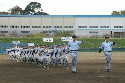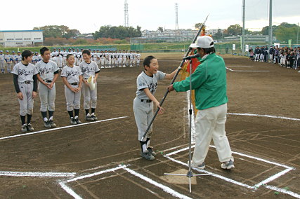 | 優勝行進:先導は富士見市山田審判員と藤野審判員 | 優勝旗を頂く青木幸也主将 |