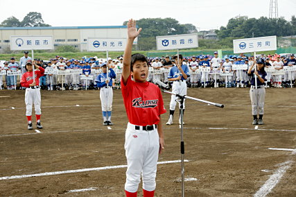 | 和光四小ベアーズ(大杉さんのチーム)の入場行進 | 選手宣誓は、新座ラディシュの金子準 主将 |